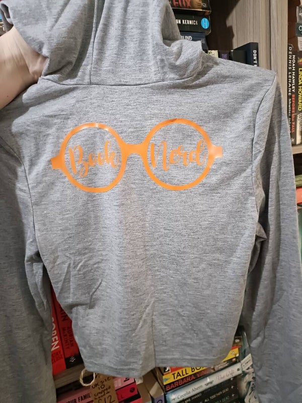 Cropped hoodie with 'book nerd' please note the printing for this one is on the back of the hoodie, the front is plain but a name can be added free of charge ❤️
